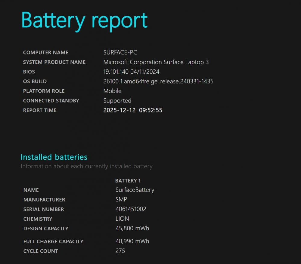 バッテリー電池の健康度は 89% です。3時間位も使用可能と表示されている。 バッテリーは消耗品の為、動作補償外となります。