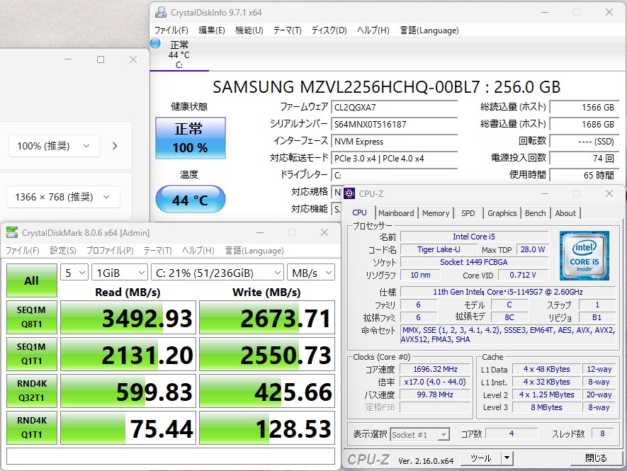 CPU:    超高速 Intel 卓越性能 第11世代Core i5-1145G7 2.6Ghz、 4コア8スレッド (ターボ・ブースト利用時の最大周波数 4.4GHz)