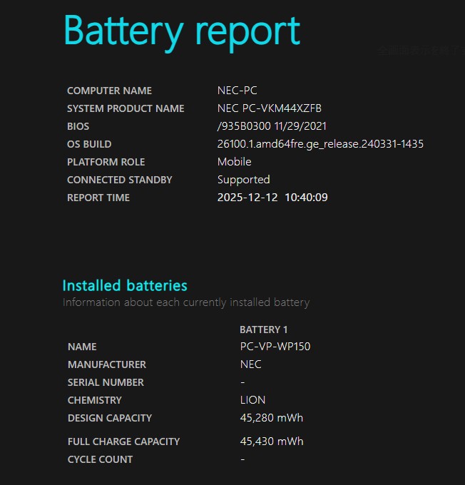 バッテリー電池の健康度は 100% です。4時間半位も使用可能と表示されている。 バッテリーは消耗品の為、動作補償外となります。