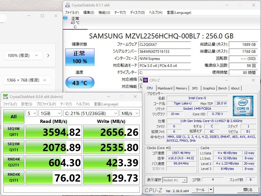 CPU:    超高速 Intel 卓越性能 第11世代Core i5-1145G7 2.6Ghz、 4コア8スレッド (ターボ・ブースト利用時の最大周波数 4.4GHz)