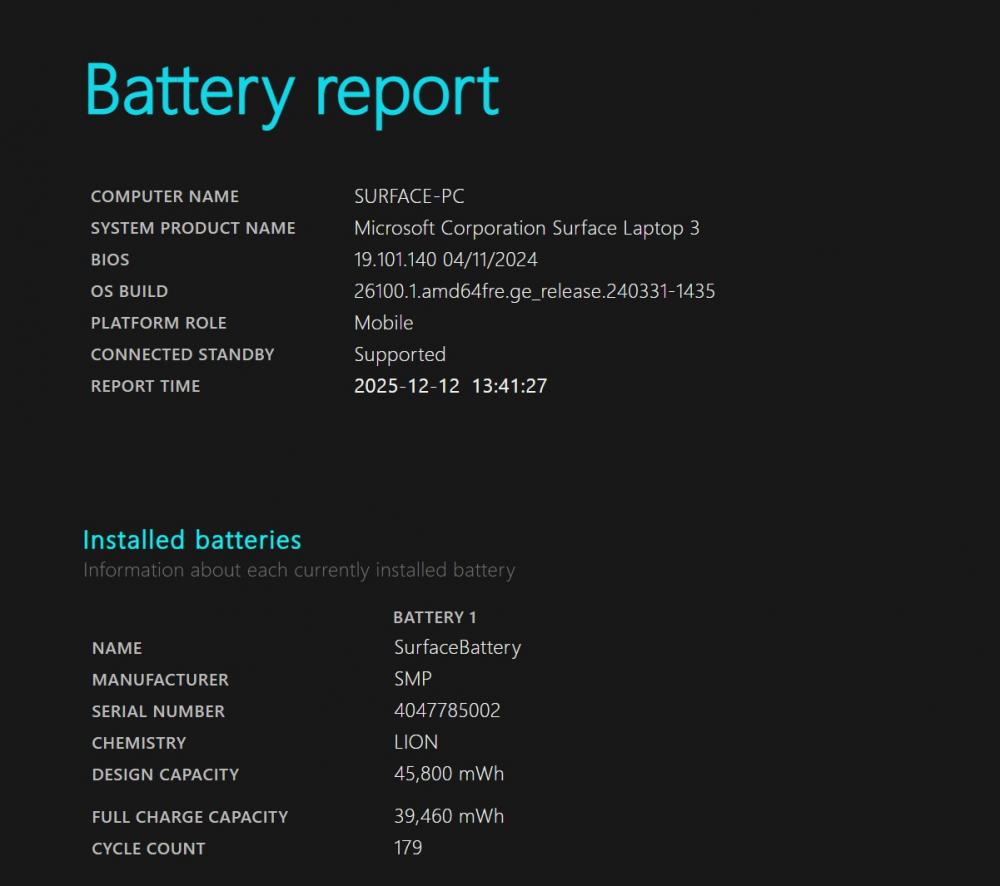 バッテリー電池の健康度は 86% です。3時間位も使用可能と表示されている。 バッテリーは消耗品の為、動作補償外となります。
