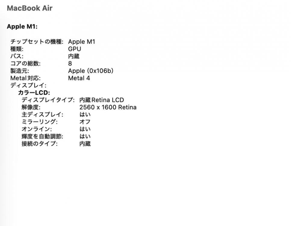 CPU:    超高速 8コア 卓越性能Apple-M1 3.2Ghz、 8コア