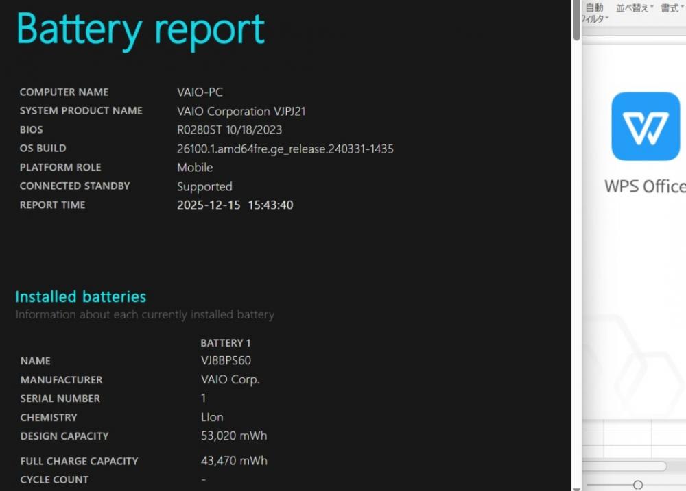 バッテリー電池の健康度は 81% です。3時間位も使用可能と表示されている。 バッテリーは消耗品の為、動作補償外となります。