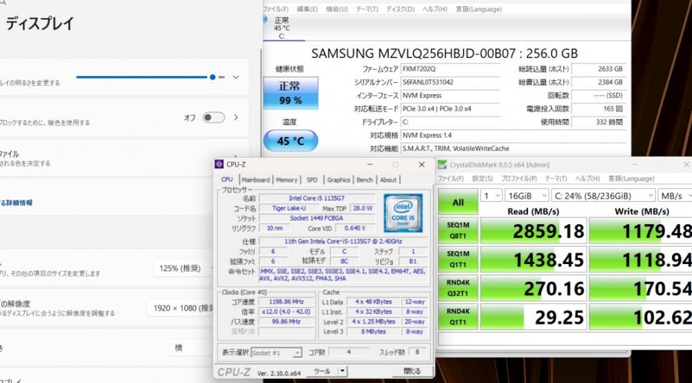 CPU:    超高速 Intel 卓越性能 第11世代Core i5-1135G7 2.4Ghz、 4コア8スレッド (ターボ・ブースト利用時の最大周波数 4.2GHz)
