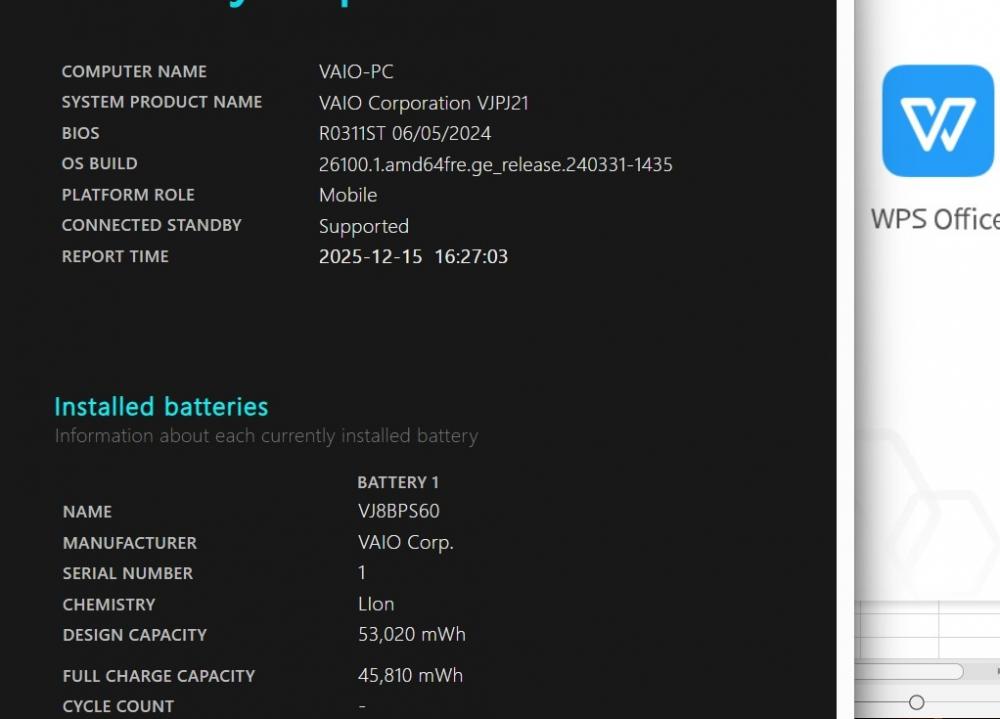 バッテリー電池の健康度は 86% です。3時間位も使用可能と表示されている。 バッテリーは消耗品の為、動作補償外となります。