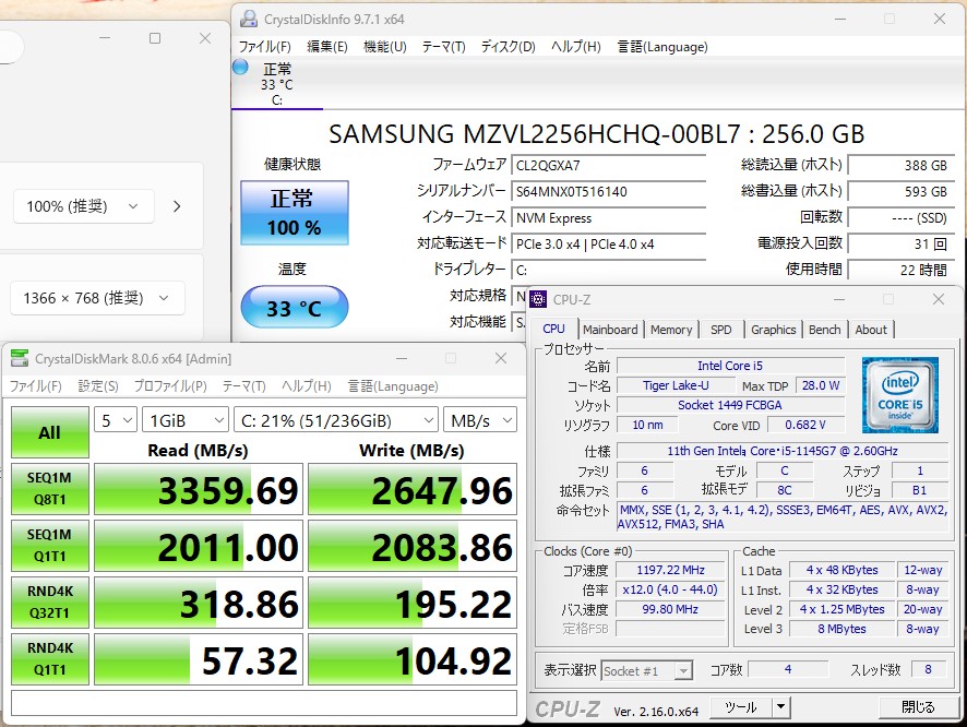 CPU:    超高速 Intel 卓越性能 第11世代Core i5-1145G7 2.6Ghz、 4コア8スレッド (ターボ・ブースト利用時の最大周波数 4.4GHz)