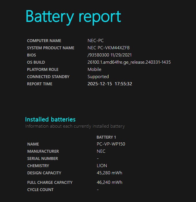 バッテリー電池の健康度は 100% です。4時間位も使用可能と表示されている。 バッテリーは消耗品の為、動作補償外となります。
