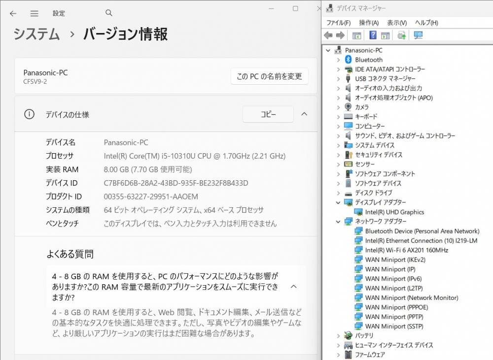 | CPU: 超高速 Intel 超高性能 第10世代Core i5-10310U 1.7Ghz、 4コア8スレッド (ターボ・ブースト利用時の最大周波数 4.4GHz) |