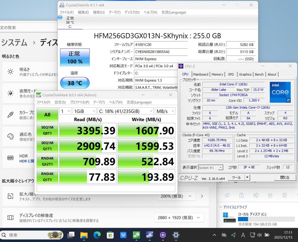 | CPU: 超高速 Intel 10コア 卓越性能 第12世代Core i7-1265u 1.8Ghz、 10コア12スレッド (ターボ・ブースト利用時の最大周波数 4.8GHz) |