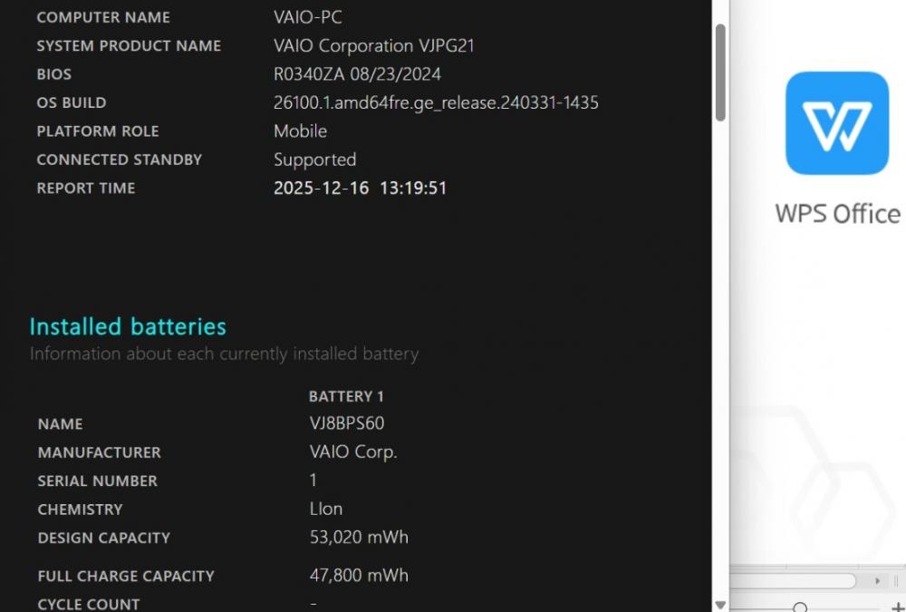 バッテリー電池の健康度は 90% です。4時間位も使用可能と表示されている。 バッテリーは消耗品の為、動作補償外となります。