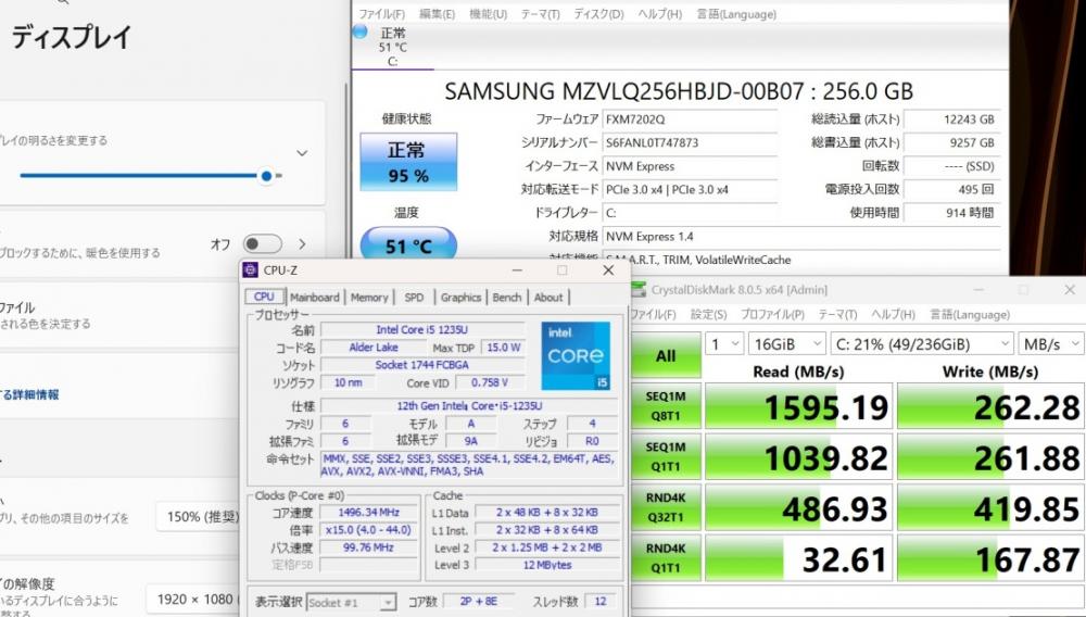 CPU:    超高速 Intel 10コア 卓越性能 第12世代Core i5-1235u 1.3Ghz、 10コア12スレッド (ターボ・ブースト利用時の最大周波数 4.4GHz)