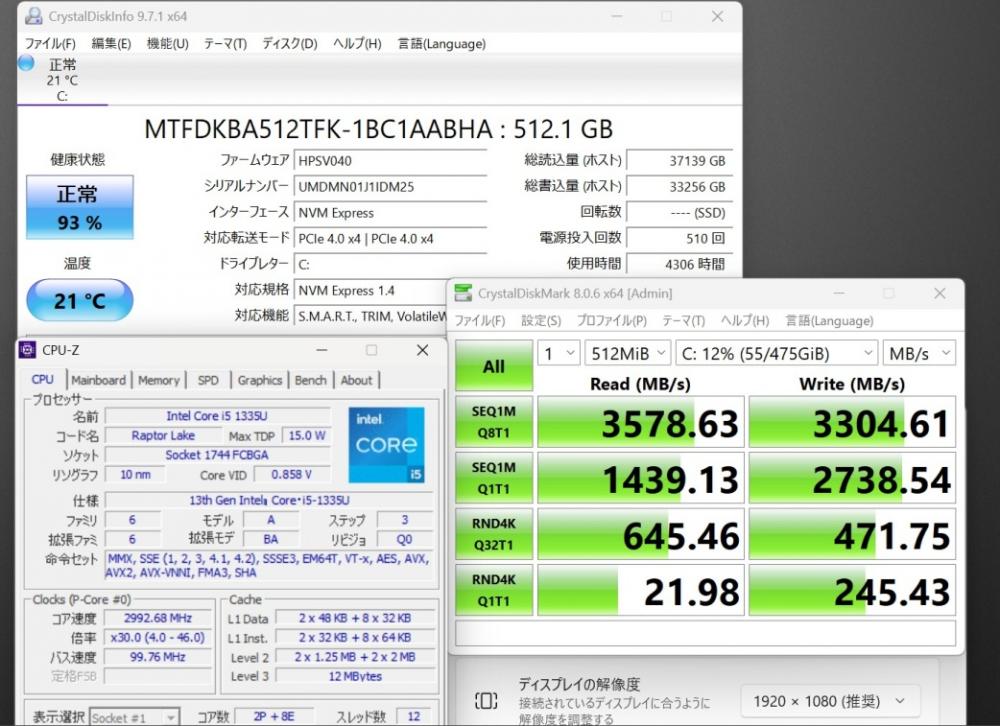 | CPU: 超高速 Intel 10コア 卓越性能 第13世代Core i5-1335U 1.3Ghz、 10コア12スレッド (ターボ・ブースト利用時の最大周波数 4.6GHz) |
