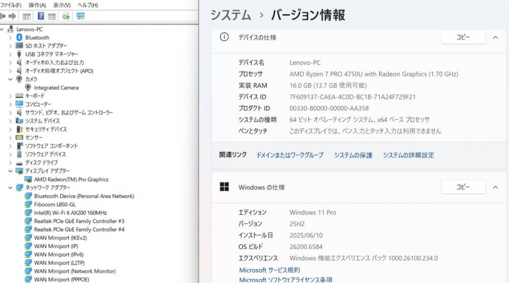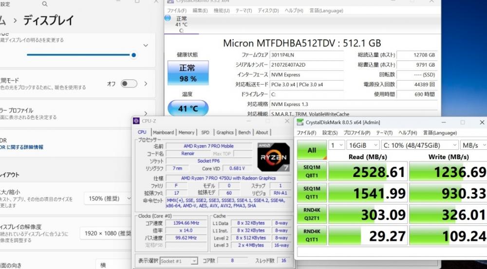 CPU:    超高速 8コア 超高性能 AMD Ryzen 7-Pro 4750u 1.7Ghz、 8コア16スレッド (ターボ・ブースト利用時の最大周波数 4.1GHz)