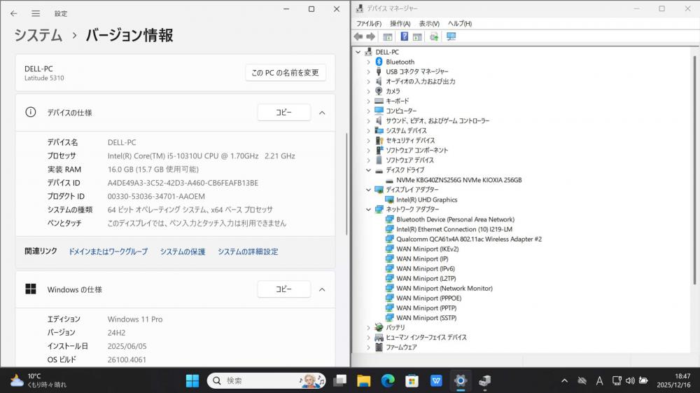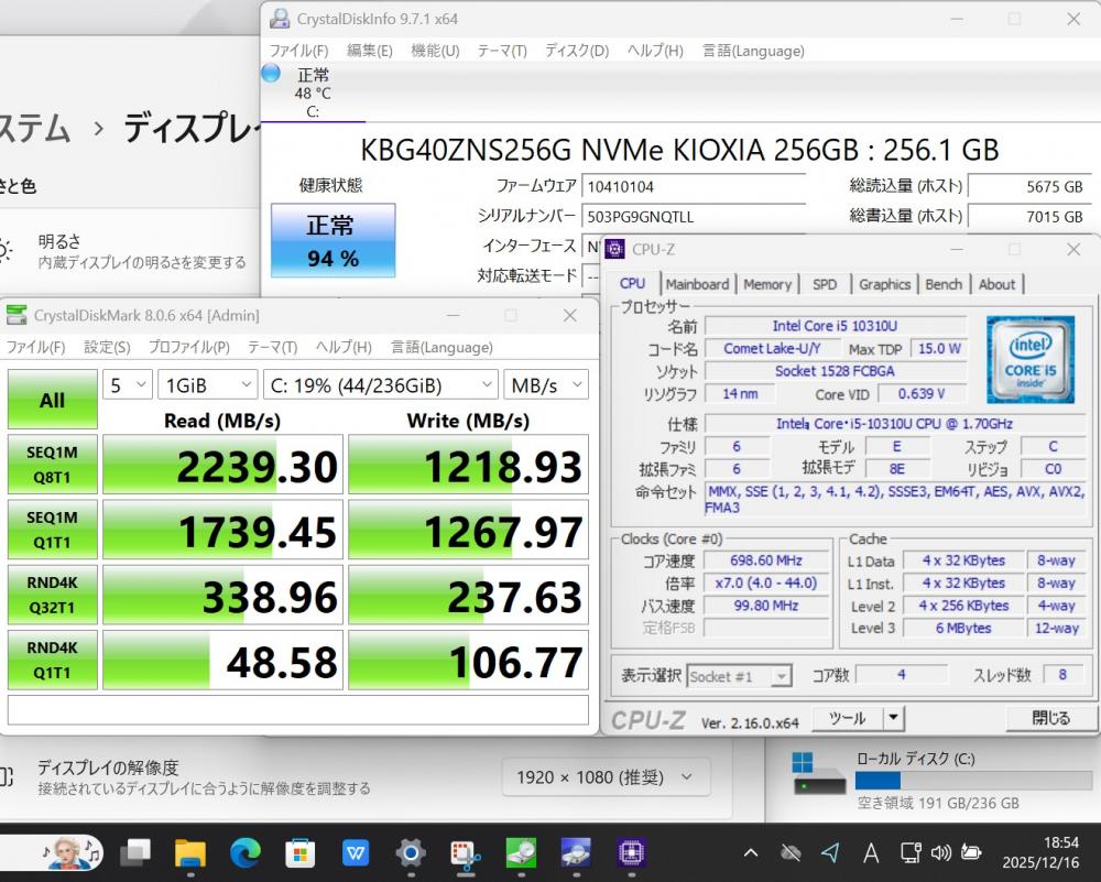 | CPU: 超高速 Intel 超高性能 第10世代Core i5-10310U 1.7Ghz、 4コア8スレッド (ターボ・ブースト利用時の最大周波数 4.4GHz) |