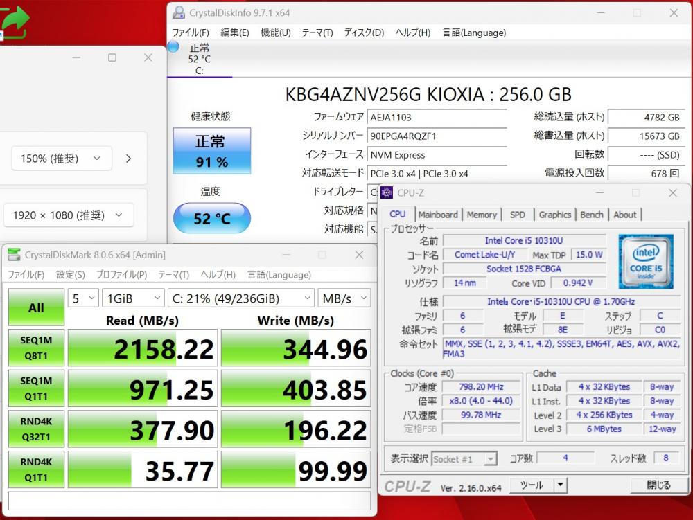 | CPU: 超高速 Intel 超高性能 第10世代Core i5-10310U 1.7Ghz、 4コア8スレッド (ターボ・ブースト利用時の最大周波数 4.4GHz) |