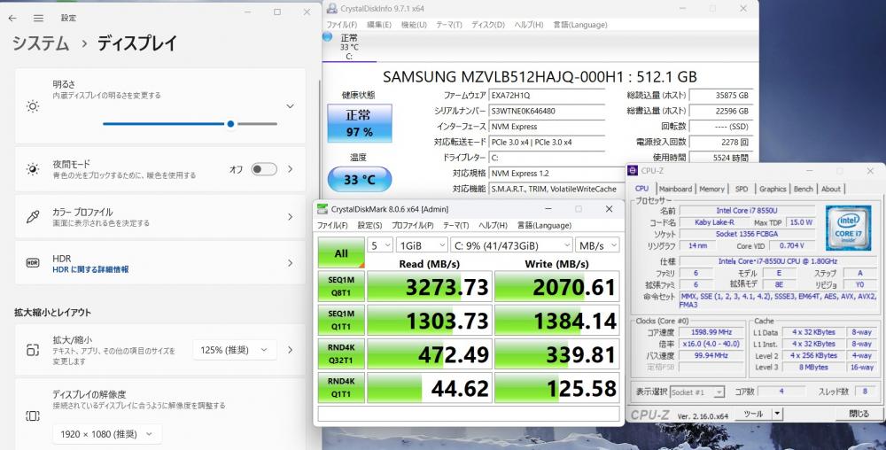 | CPU: 高性能 第8世代Core i7-8550U 1.8Ghz、 4コア8スレッド (ターボ・ブースト利用時の最大周波数 4.0GHz) |