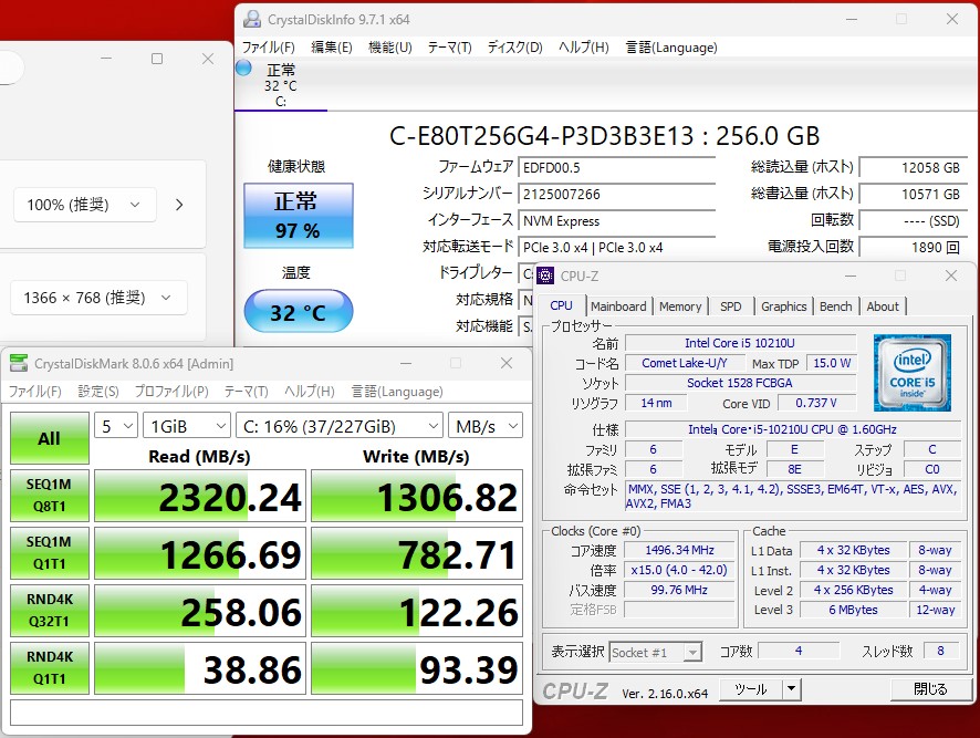| CPU: 超高速 Intel 超高性能 第10世代Core i5-10210U 1.6Ghz、 4コア8スレッド (ターボ・ブースト利用時の最大周波数 4.2GHz) |