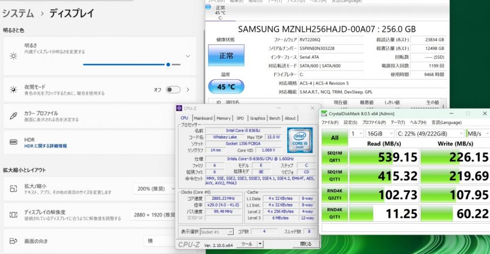 | CPU: 超高速 Intel 高性能 第8世代Core i5-8365u 1.6Ghz、 4コア8スレッド (ターボ・ブースト利用時の最大周波数 4.1GHz) |
