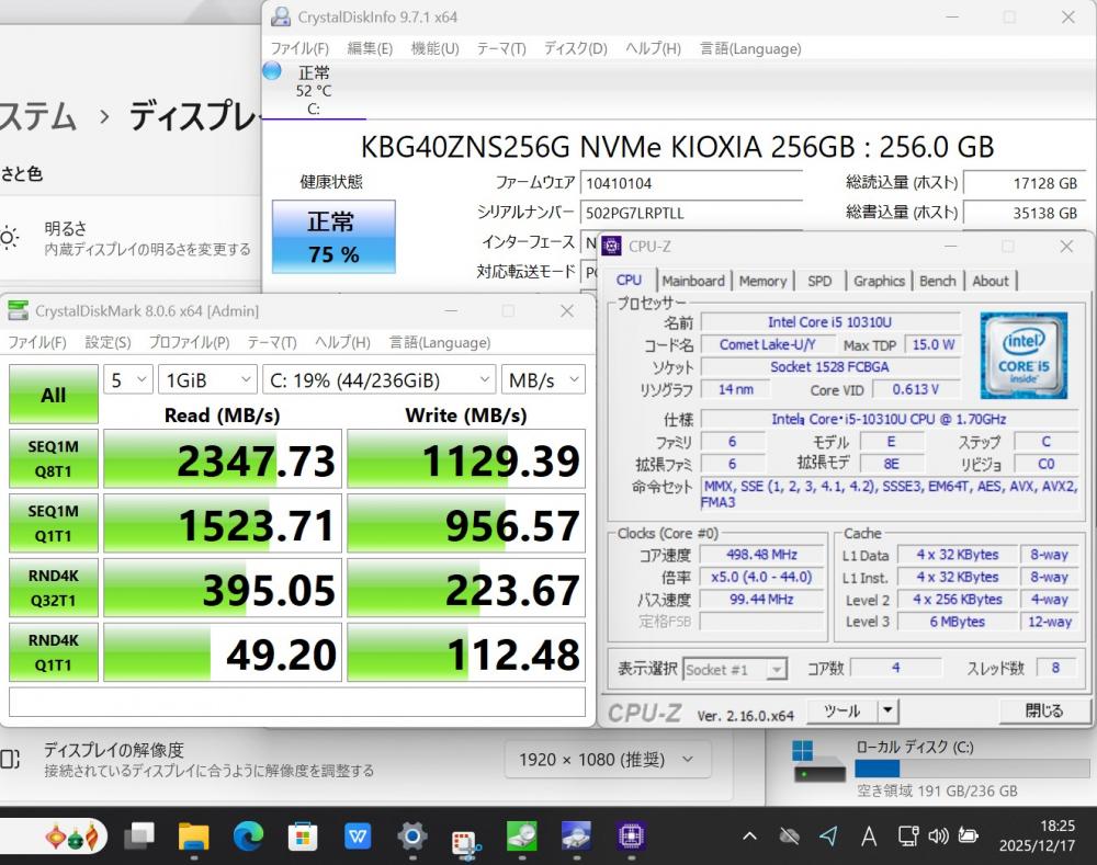 | CPU: 超高速 Intel 超高性能 第10世代Core i5-10310U 1.7Ghz、 4コア8スレッド (ターボ・ブースト利用時の最大周波数 4.4GHz) |