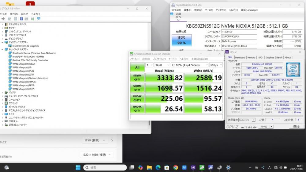 | CPU: 超高速 Intel 卓越性能 第11世代Core i7-1165G7 2.8Ghz、 4コア8スレッド (ターボ・ブースト利用時の最大周波数 4.7GHz) |