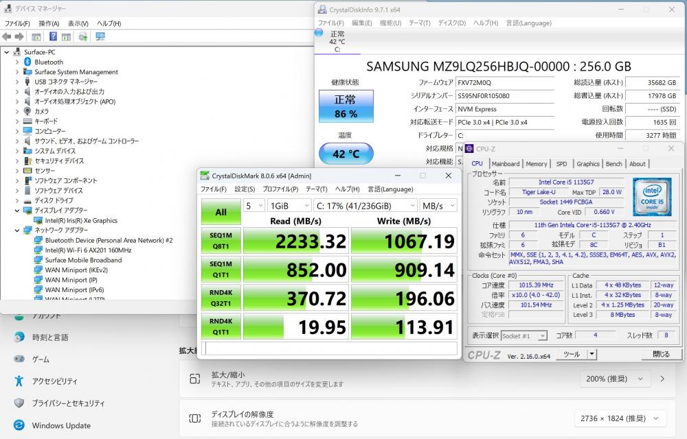 | CPU: 超高速 Intel 卓越性能 第11世代Core i5-1135G7 2.4Ghz、 4コア8スレッド (ターボ・ブースト利用時の最大周波数 4.2GHz) |