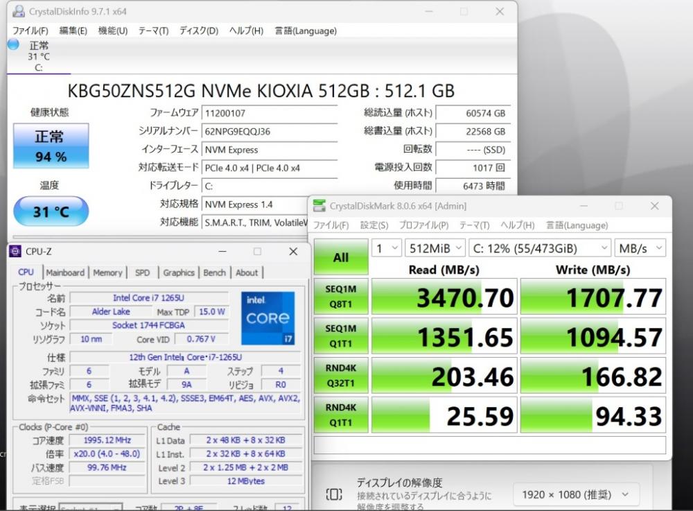 | CPU: 超高速 Intel 10コア 卓越性能 第12世代Core i7-1265U 1.8Ghz、 10コア12スレッド (ターボ・ブースト利用時の最大周波数 4.8GHz) |
