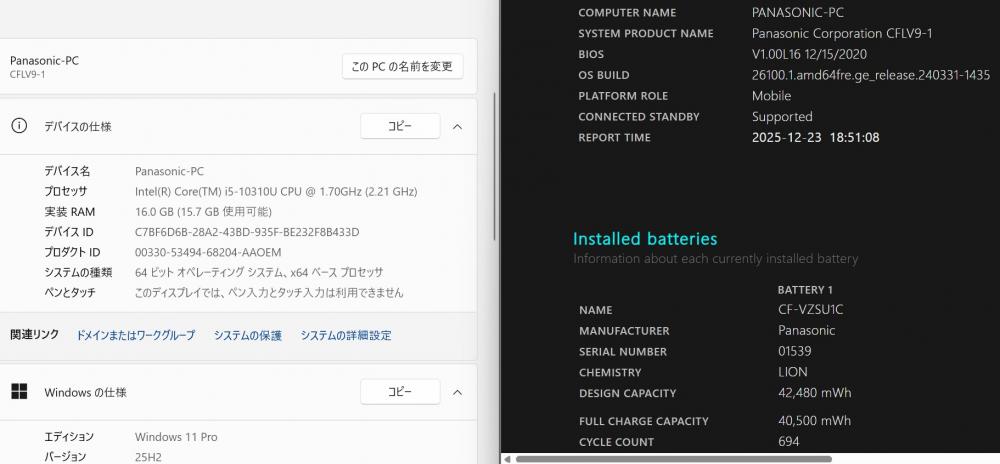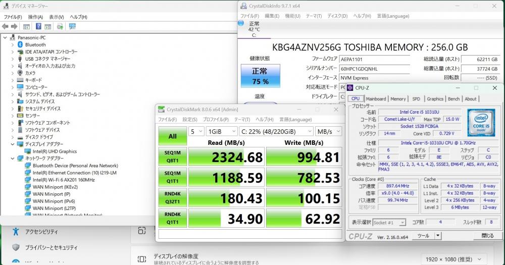 | CPU: 超高速 Intel 超高性能 第10世代Core i5-10310U 1.7Ghz、 4コア8スレッド (ターボ・ブースト利用時の最大周波数 4.4GHz) |