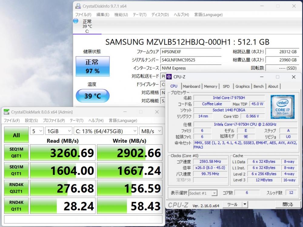 | CPU: 超高速 Intel 超高性能 第9世代Core i7-9750H 2.6Ghz、 6コア12スレッド (ターボ・ブースト利用時の最大周波数 4.5GHz) |