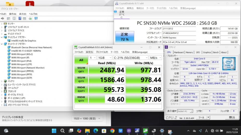CPU:    超高速 Intel 卓越性能 第11世代Core i5-1145G7 2.6Ghz、 4コア8スレッド (ターボ・ブースト利用時の最大周波数 4.4GHz)