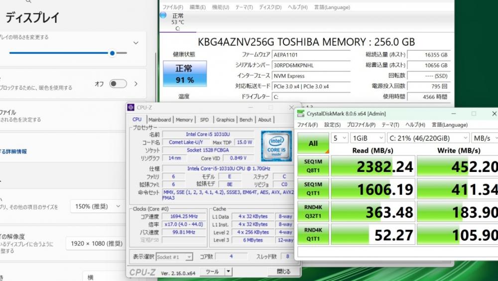 | CPU: 超高速 Intel 超高性能 第10世代Core i5-10310U 1.7Ghz、 4コア8スレッド (ターボ・ブースト利用時の最大周波数 4.4GHz) |