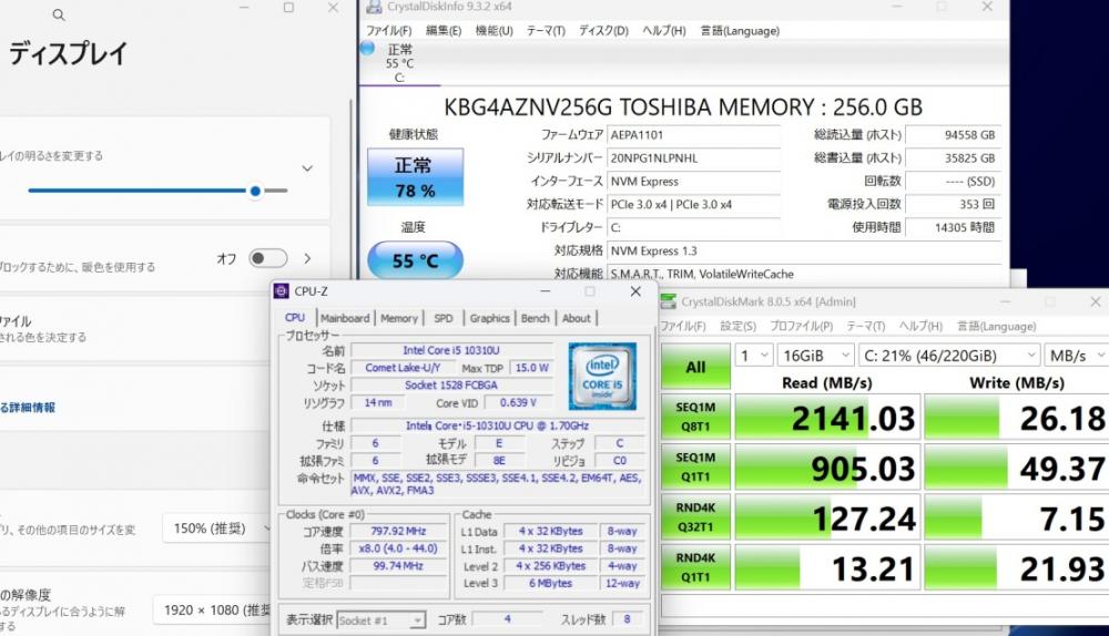 | CPU: 超高速 Intel 超高性能 第10世代Core i5-10310U 1.7Ghz、 4コア8スレッド (ターボ・ブースト利用時の最大周波数 4.4GHz) |