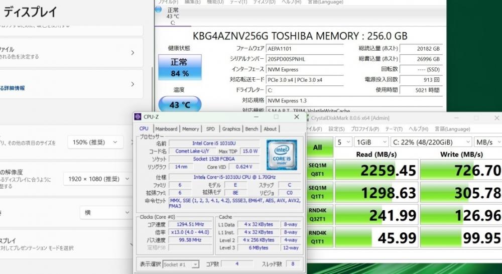 | CPU: 超高速 Intel 超高性能 第10世代Core i5-10310U 1.7Ghz、 4コア8スレッド (ターボ・ブースト利用時の最大周波数 4.4GHz) |