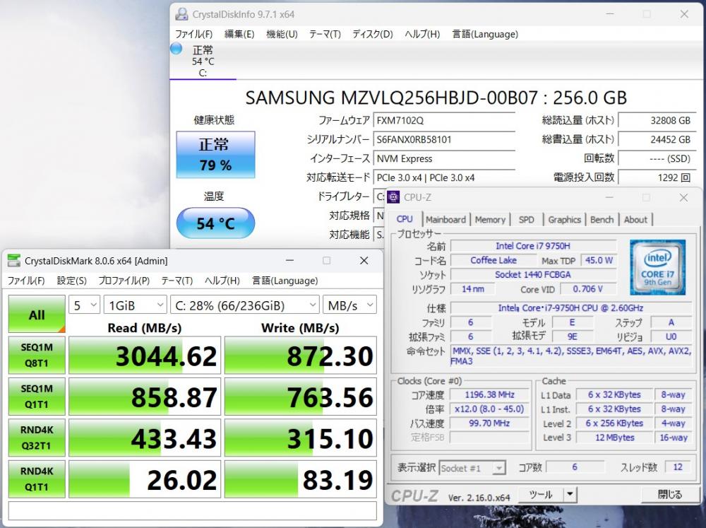 | CPU: 超高速 Intel 超高性能 第9世代Core i7-9750H 2.2Ghz、 6コア12スレッド (ターボ・ブースト利用時の最大周波数 4.1GHz) |