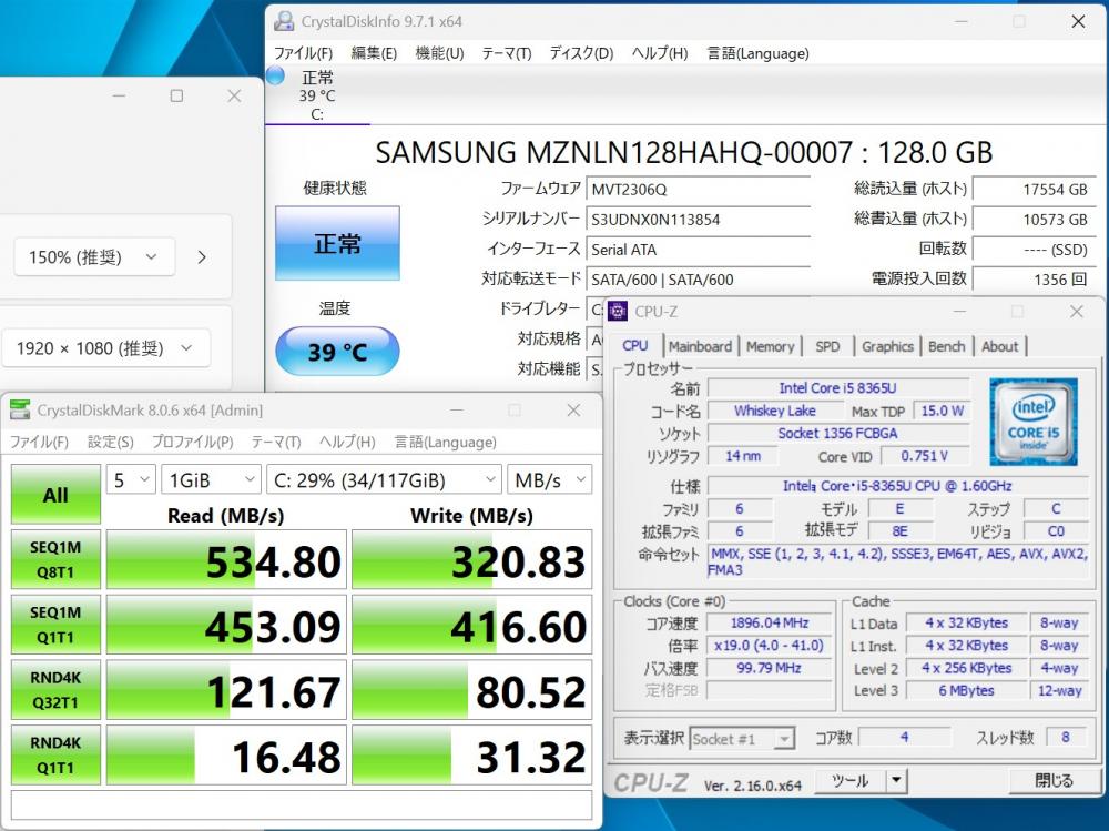 | CPU: 超高速 Intel 高性能 第8世代Core i5-8365U 1.6Ghz、 4コア8スレッド (ターボ・ブースト利用時の最大周波数 4.1GHz) |