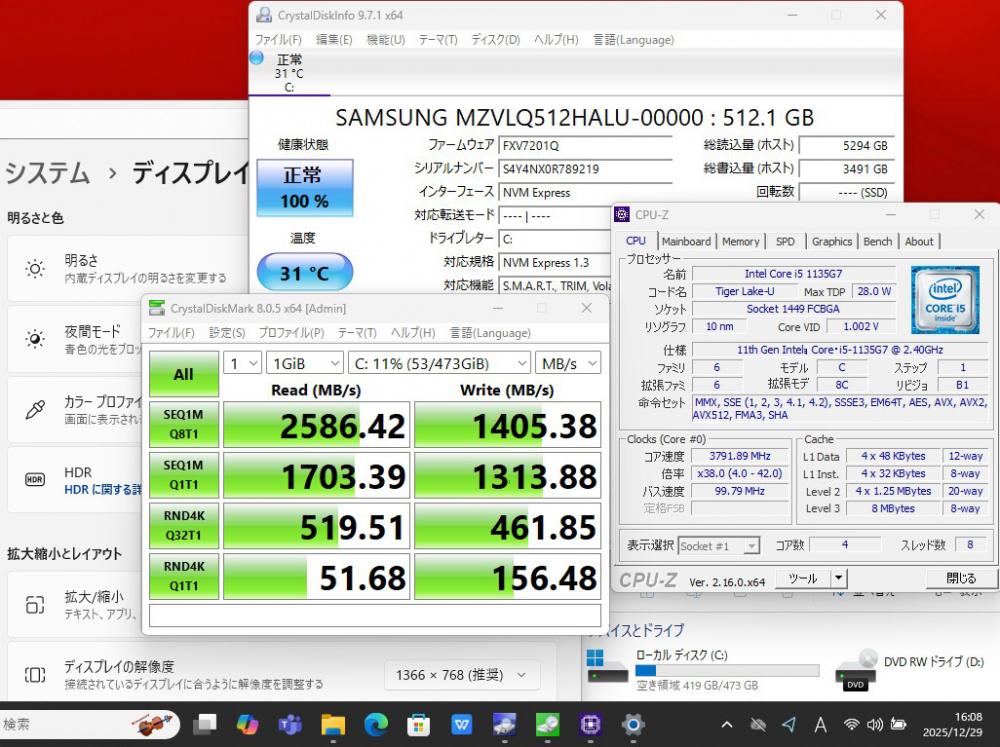 | CPU: 超高速 Intel 卓越性能 第11世代Core i5-1135G7 2.4Ghz、 4コア8スレッド (ターボ・ブースト利用時の最大周波数 4.2GHz) |
