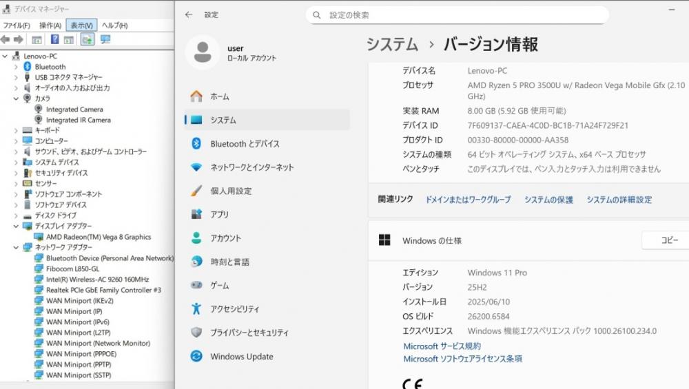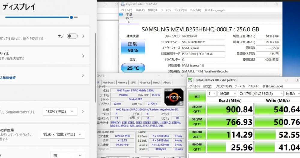 CPU:    超高速 高性能 AMD Ryzen 5-Pro 3500u 2.1Ghz、 4コア8スレッド (ターボ・ブースト利用時の最大周波数 3.7GHz)