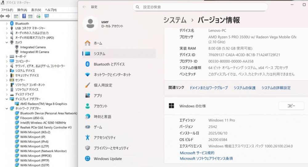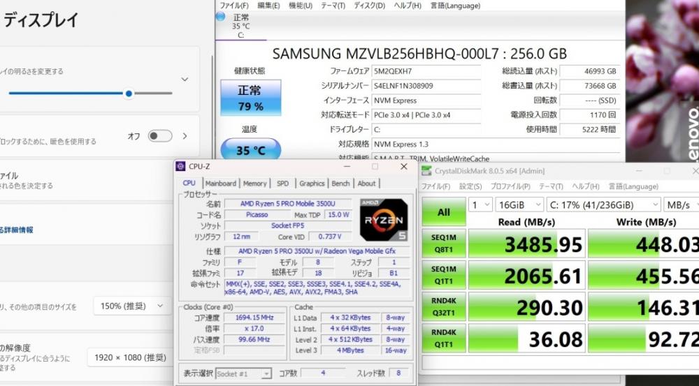 CPU:    超高速 高性能 AMD Ryzen 5-Pro 3500u 2.1Ghz、 4コア8スレッド (ターボ・ブースト利用時の最大周波数 3.7GHz)