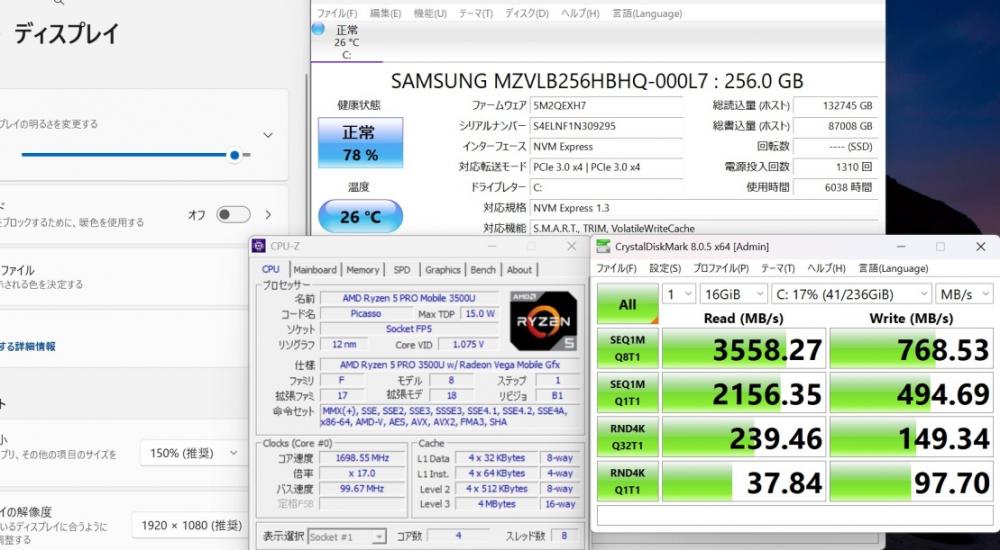 ハードディスク:  爆速NVMe式 SSD 256GB超高速ドライブを搭載  静かで耐衝撃性に優れ、OSやプログラムなどのソフトの起動速度が大幅に高速化します!!