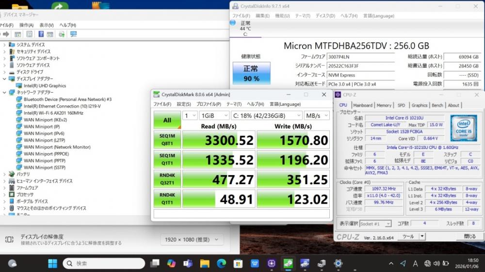 | CPU: 超高速 Intel 超高性能 第10世代Core i5-10210u 1.6Ghz、 4コア8スレッド (ターボ・ブースト利用時の最大周波数 4.2GHz) |