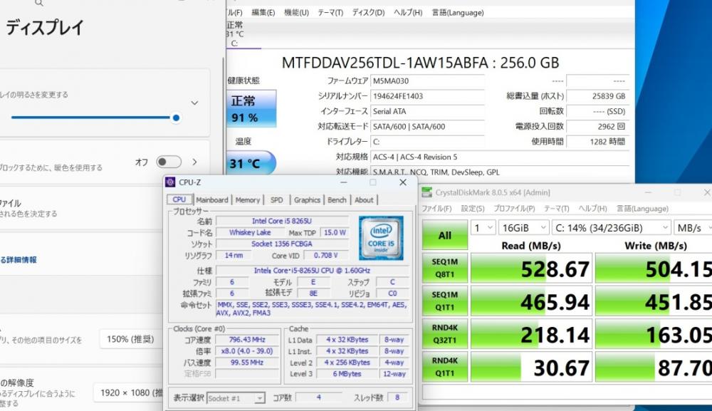 CPU:    超高速 Intel 高性能 第8世代Core i5-8265u 1.6Ghz、 4コア8スレッド (ターボ・ブースト利用時の最大周波数 3.9GHz)