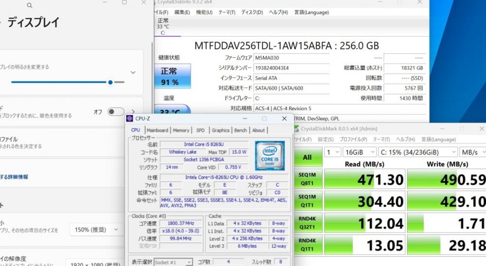 CPU:    超高速 Intel 高性能 第8世代Core i5-8265u 1.6Ghz、 4コア8スレッド (ターボ・ブースト利用時の最大周波数 3.9GHz)