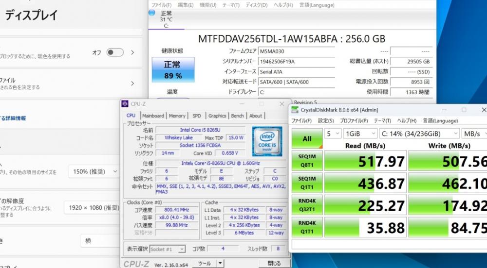CPU:    超高速 Intel 高性能 第8世代Core i5-8265u 1.6Ghz、 4コア8スレッド (ターボ・ブースト利用時の最大周波数 3.9GHz)