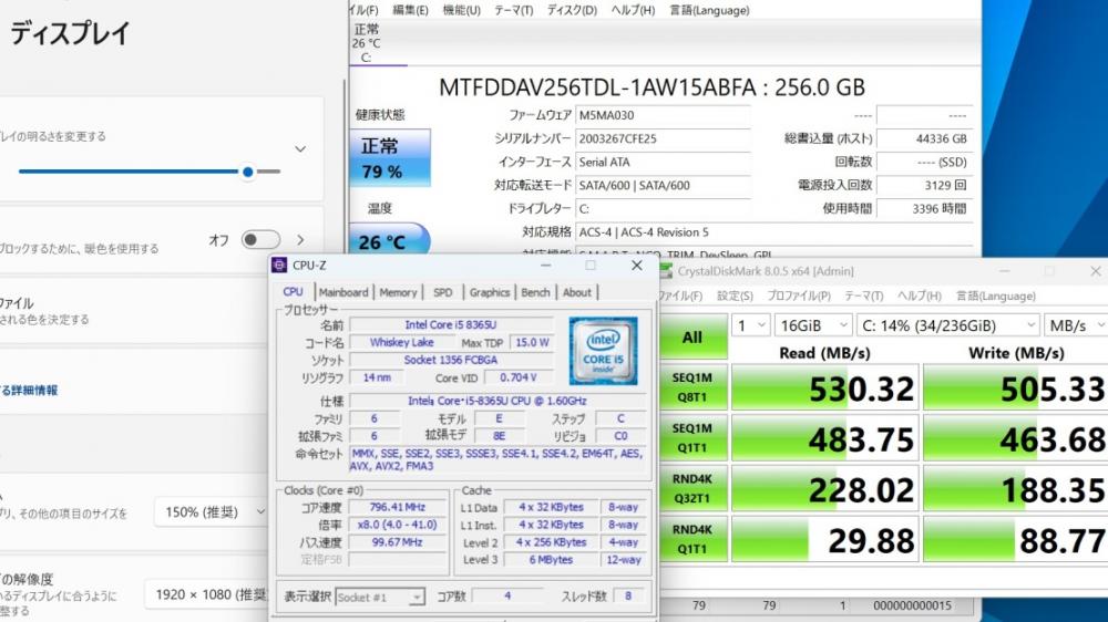 | CPU: 超高速 Intel 高性能 第8世代Core i5-8365u 1.6Ghz、 4コア8スレッド (ターボ・ブースト利用時の最大周波数 4.1GHz) |