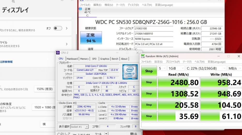 CPU:    超高速 Intel 超高性能 第10世代Core i7-10610u 1.8Ghz、 4コア8スレッド (ターボ・ブースト利用時の最大周波数 4.9GHz)
