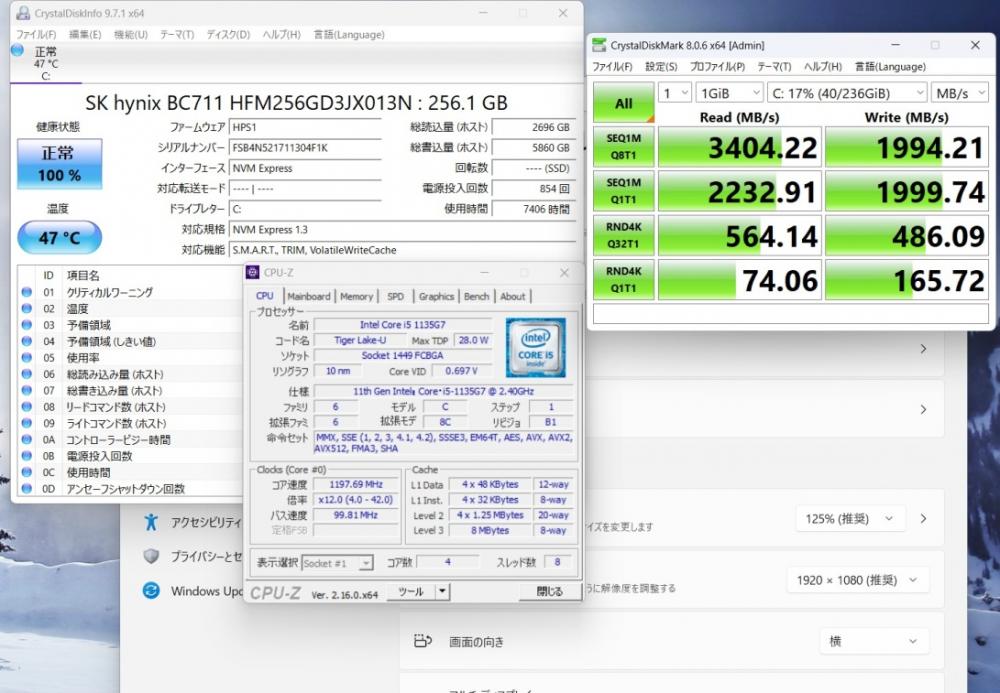 | CPU: 超高速 Intel 卓越性能 第11世代Core i5-1135G7 2.4Ghz、 4コア8スレッド (ターボ・ブースト利用時の最大周波数 4.2GHz) |