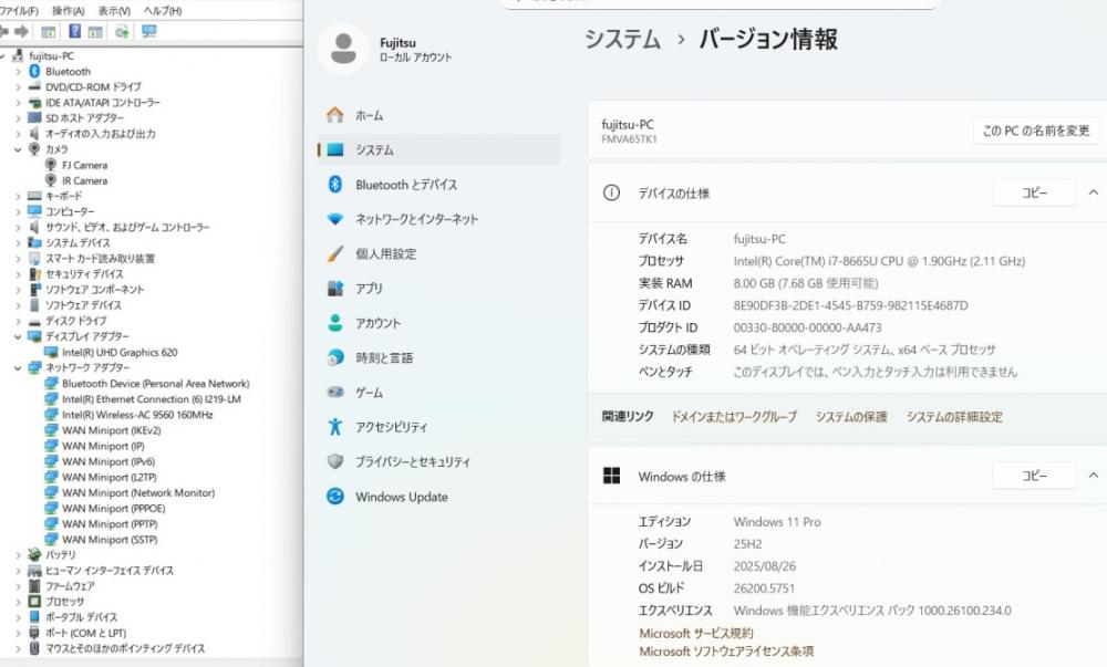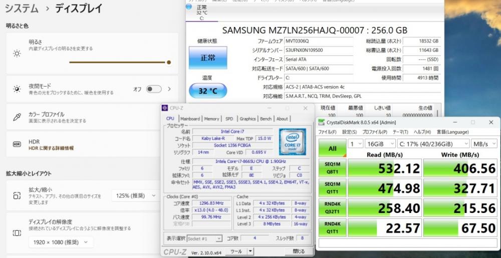 | CPU: 超高速 Intel 高性能 第8世代Core i7-8665u 1.9Ghz、 4コア8スレッド (ターボ・ブースト利用時の最大周波数 4.8GHz) |