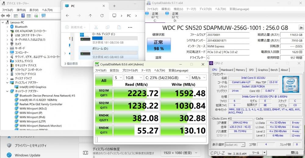 CPU:    超高速 Intel 超高性能 第10世代Core i5-10210U 1.6Ghz、 4コア8スレッド (ターボ・ブースト利用時の最大周波数 4.2GHz)