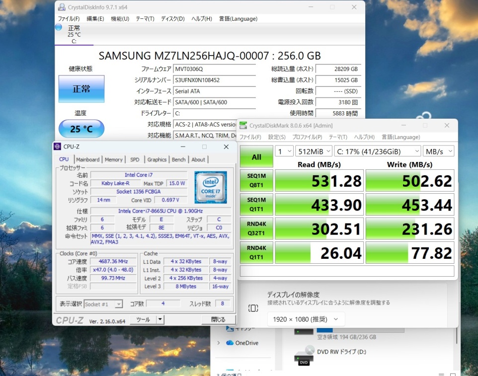 | CPU: 超高速 Intel 高性能 第8世代Core i7-8665U 1.9Ghz、 4コア8スレッド (ターボ・ブースト利用時の最大周波数 4.8GHz) |
