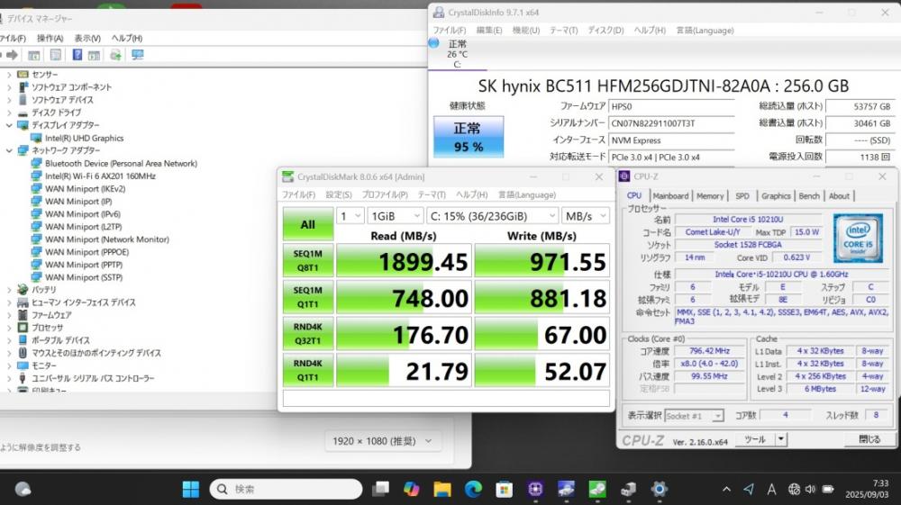 | CPU: 超高速 Intel 超高性能 第10世代Core i5-10210u 1.6Ghz、 4コア8スレッド (ターボ・ブースト利用時の最大周波数 4.2GHz) |