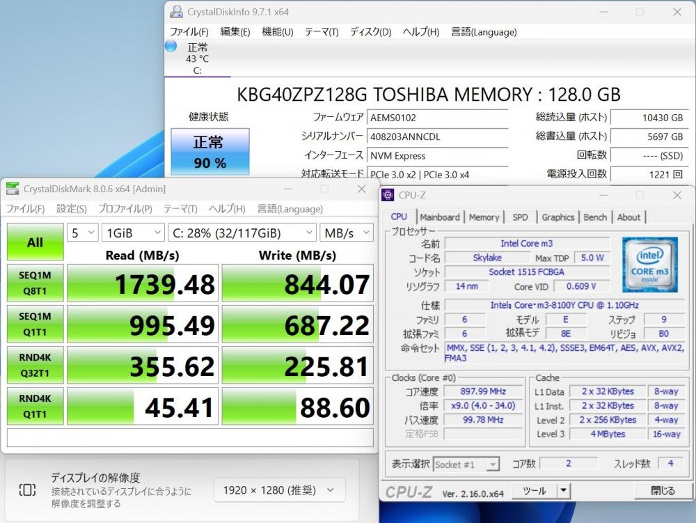 | CPU: 超高速 Intel CoreM 8100Y 1.1Ghz、 2コア4スレッド (ターボ・ブースト利用時の最大周波数 3.4GHz) |
